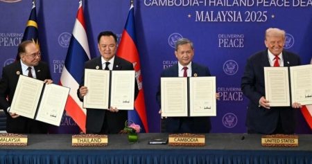 মার্কিন প্রেসিডেন্ট ডোনাল্ড ট্রাম্পের মধ্যস্থতায় শান্তি চুক্তি সই করেছে থাইল্যান্ড ও কম্বোডিয়া। রোববার মালয়েশিয়ায় আসিয়ান শীর্ষ সম্মেলনের ফাঁকে এই চুক্তিতে স্বাক্ষর করেন থাইল্যান্ডের প্রধানমন্ত্রী অনুতিন চার্নভিরাকুল ও কম্বোডিয়ার প্রধানমন্ত্রী হুন মানেত। এই চুক্তি স্বাক্ষর অনুষ্ঠানে সভাপতিত্ব করেন ট্রাম্প। খবর বিবিসির।
