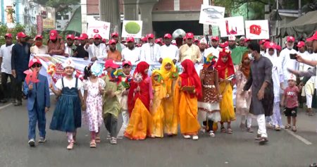 দেশীয় সাংস্কৃতিক সংসদের ব্যানারে মঙ্গলবার (১৪ এপ্রিল) এই আয়োজন প্রেসক্লাবের সামনে শুরু হয়ে রমনা পার্কে গিয়ে শেষ হয়।