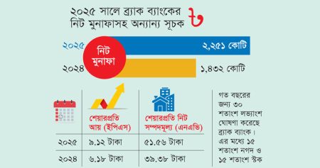 ২০২৫ সালে ব্যাংকটির নিট মুনাফা দাঁড়িয়েছে ২ হাজার ২৫১ কোটি টাকায়। এর আগে ২০২৪ সালে করেছিল ১ হাজার ৪৩২ কোটি টাকার নিট মুনাফা। সে হিসাবে গত বছর ব্যাংকটির নিট মুনাফা ৫৭ শতাংশ বেড়েছে। ব্র্যাক ব্যাংকের গতকালের পর্ষদ সভায় ২০২৫ সালের নিরীক্ষিত আর্থিক প্রতিবেদন অনুমোদন করা হয়েছে। সভা থেকে ব্যাংকটির শেয়ারধারীদের জন্য ৩০ শতাংশ লভ্যাংশ ঘোষণা করা হয়েছে। এর মধ্যে ১৫ শতাংশ নগদ ও বাকি ১৫ শতাংশ স্টক হিসেবে দেয়া হবে বলে ব্যাংকটি থেকে জানানো হয়।